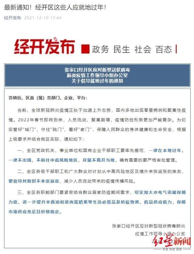 12月9日,河北張家口經(jīng)開區(qū)也發(fā)出通知:全區(qū)黨政機(jī)關(guān)職工等就地過年。通知中倡導(dǎo):全區(qū)黨政機(jī)關(guān)、事業(yè)單位和國有企業(yè)干部職工要率先垂范,一律在本地過年,一律不出境,不前往中高風(fēng)險地區(qū),盡量不離開當(dāng)?shù)兀_有需要的要嚴(yán)格審批管理。