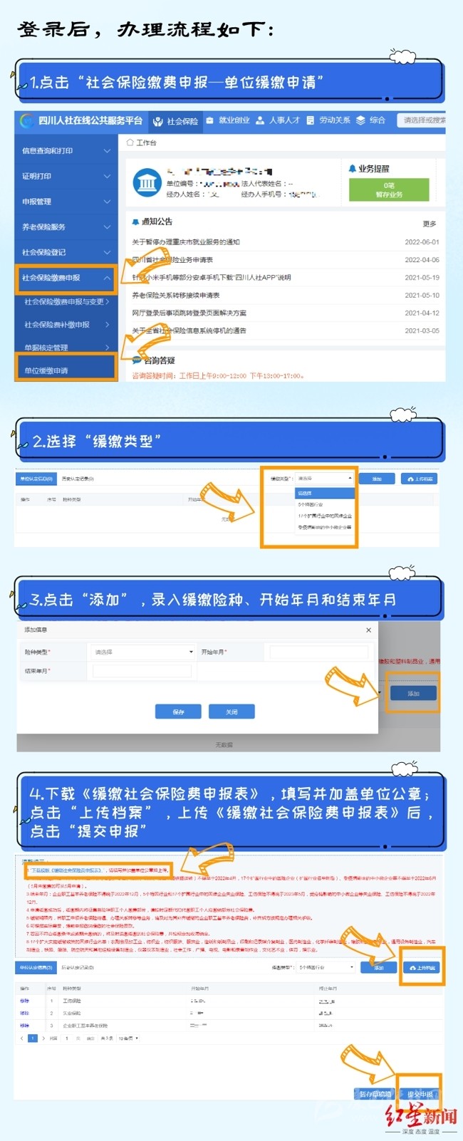 7月26日,紅星新聞?dòng)浾邚某啥际腥松缇肢@悉,今年6月,四川省人社廳、省發(fā)改委、省財(cái)政廳、省稅務(wù)局聯(lián)合出臺(tái)的《關(guān)于擴(kuò)大階段性緩繳社會(huì)保險(xiǎn)費(fèi)政策實(shí)施范圍等問(wèn)題的通知》,明確了延長(zhǎng)階段性減免企業(yè)基本養(yǎng)老保險(xiǎn)、失業(yè)保險(xiǎn)、工傷保險(xiǎn)單位繳費(fèi)政策實(shí)施期限,同時(shí)將階段性緩繳社會(huì)保險(xiǎn)費(fèi)政策擴(kuò)圍至22個(gè)行業(yè)。