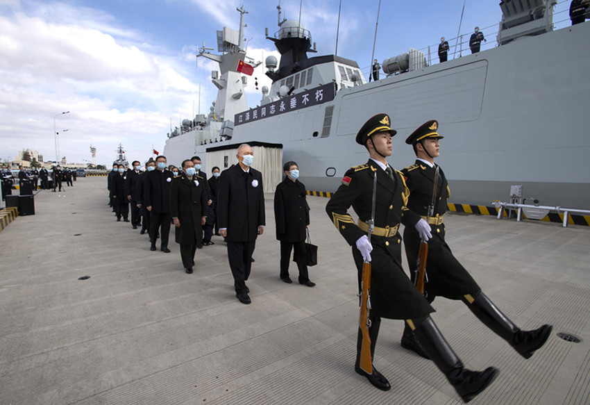 中國人民解放軍海軍揚(yáng)州艦伏波靜臥,艦上官兵分區(qū)列隊(duì)、肅立舷邊。揚(yáng)州是江澤民同志的故鄉(xiāng)。今天,這艘以揚(yáng)州命名的軍艦,以最高禮儀送別這位為黨和人民建立了不朽功勛的卓越領(lǐng)導(dǎo)人。江澤民同志的親屬捧護(hù)著骨灰登上揚(yáng)州艦。海軍笛吹響,儀仗隊(duì)持槍肅立,行注目禮。當(dāng)揚(yáng)州艦起航時(shí),軍港內(nèi)所有艦船汽笛長鳴,響徹云霄。