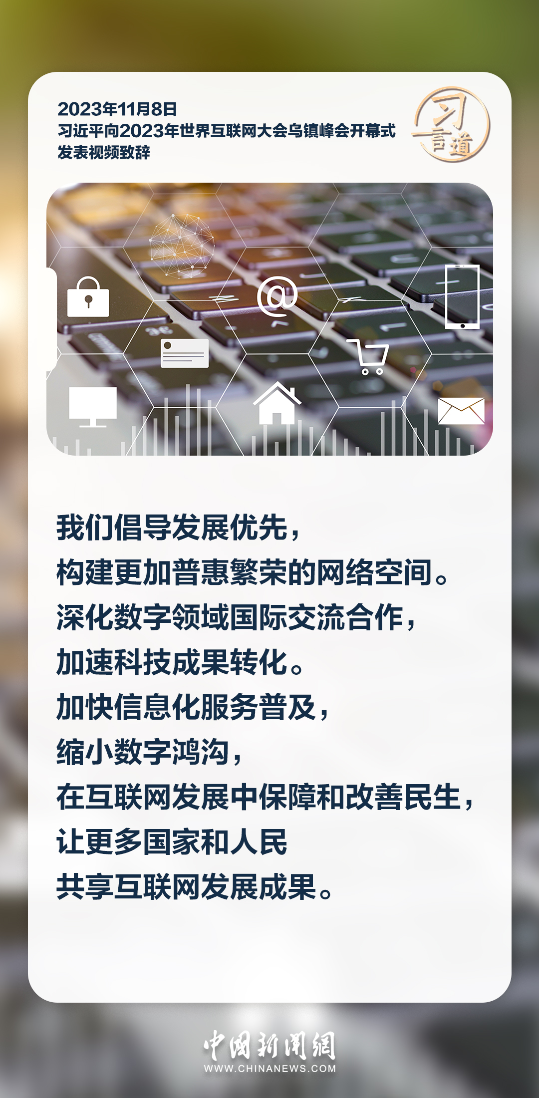 11月8日上午,國家主席習(xí)近平向2023年世界互聯(lián)網(wǎng)大會烏鎮(zhèn)峰會開幕式發(fā)表視頻致辭。習(xí)近平指出——