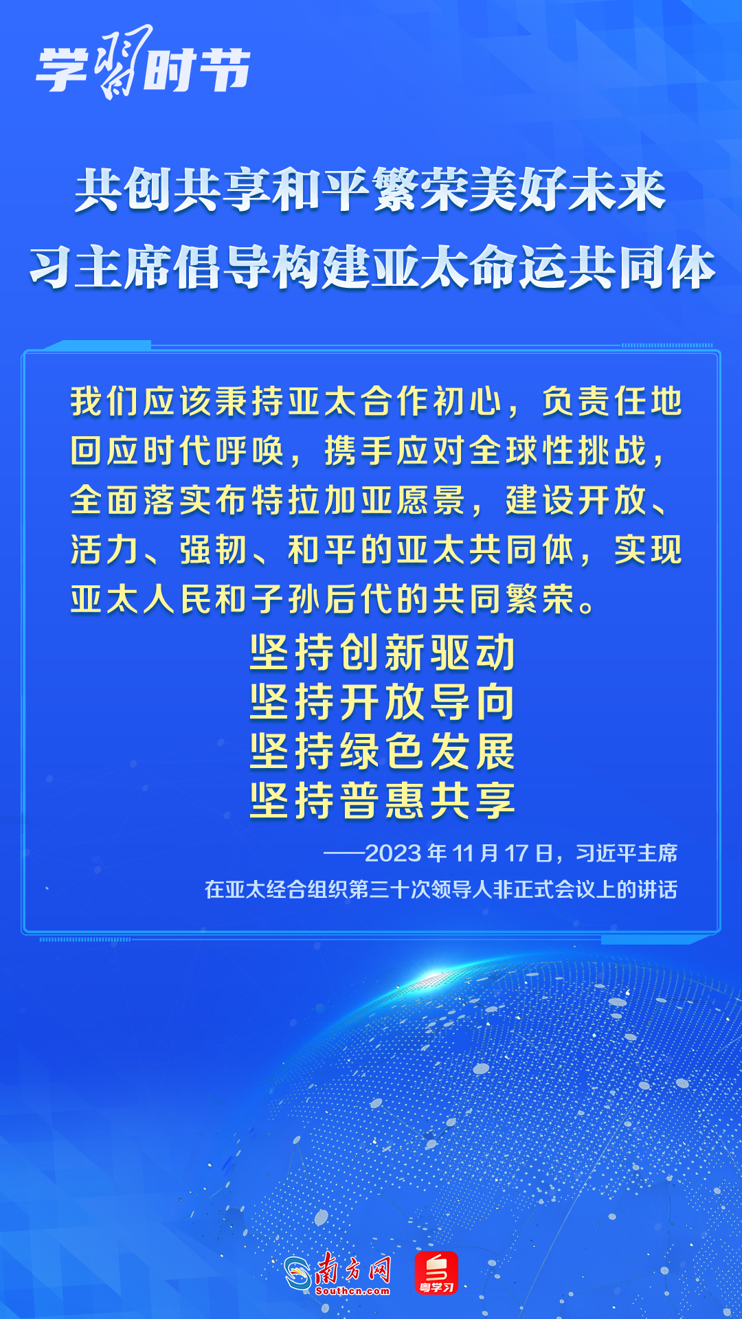 當(dāng)?shù)貢r(shí)間11月17日上午,亞太經(jīng)合組織第三十次領(lǐng)導(dǎo)人非正式會(huì)議在美國(guó)舊金山舉行。國(guó)家主席習(xí)近平出席會(huì)議并發(fā)表題為《堅(jiān)守初心 團(tuán)結(jié)合作 攜手共促亞太高質(zhì)量增長(zhǎng)》的重要講話。