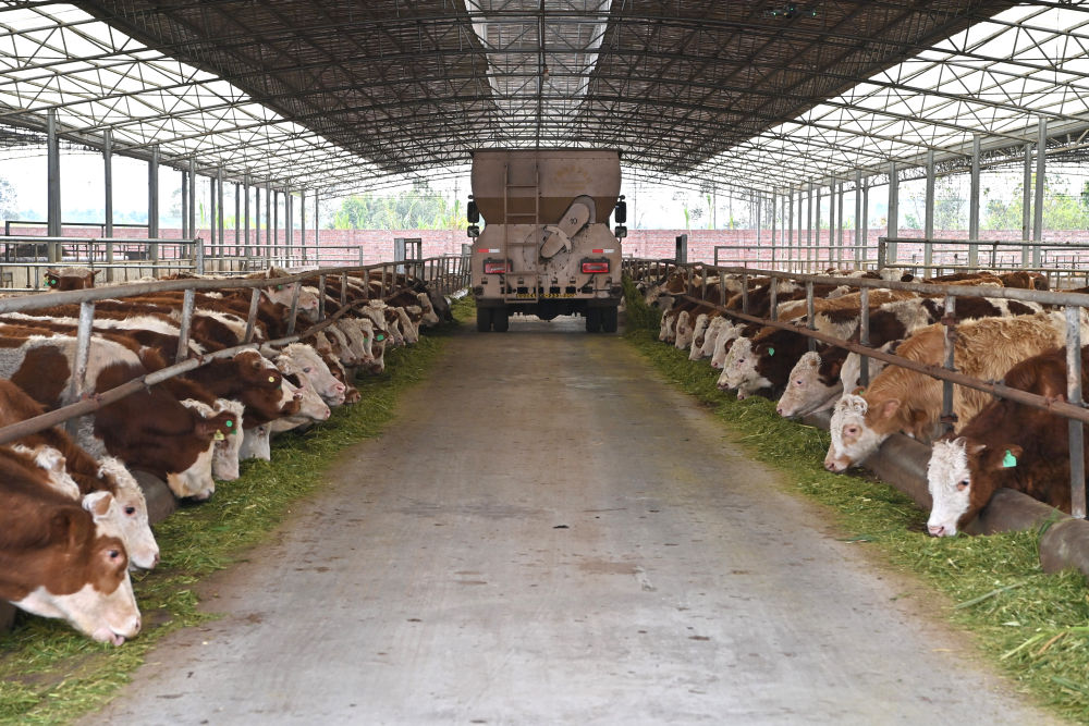 12月13日,在來賓市興賓區(qū)大灣鎮(zhèn)雙誠牧業(yè)有限公司,工人駕駛車輛給牛投撒以甘蔗尾葉為主要原料的飼料。