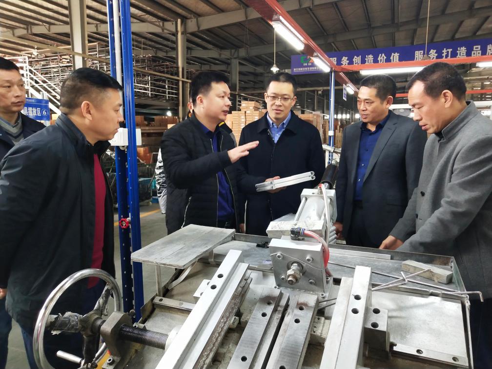 熊樹生(左三)在龍泉市一家企業(yè)車間內介紹汽車空調冷凝器。受訪者供圖