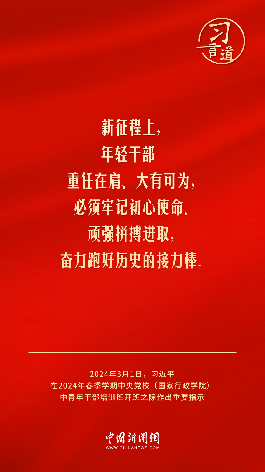 年輕干部是黨和國(guó)家事業(yè)發(fā)展的生力軍,是中國(guó)特色社會(huì)主義事業(yè)的接班人。3月1日,2024年春季學(xué)期中央黨校(國(guó)家行政學(xué)院)中青年干部培訓(xùn)班開(kāi)班。習(xí)近平總書(shū)記作出重要指示。