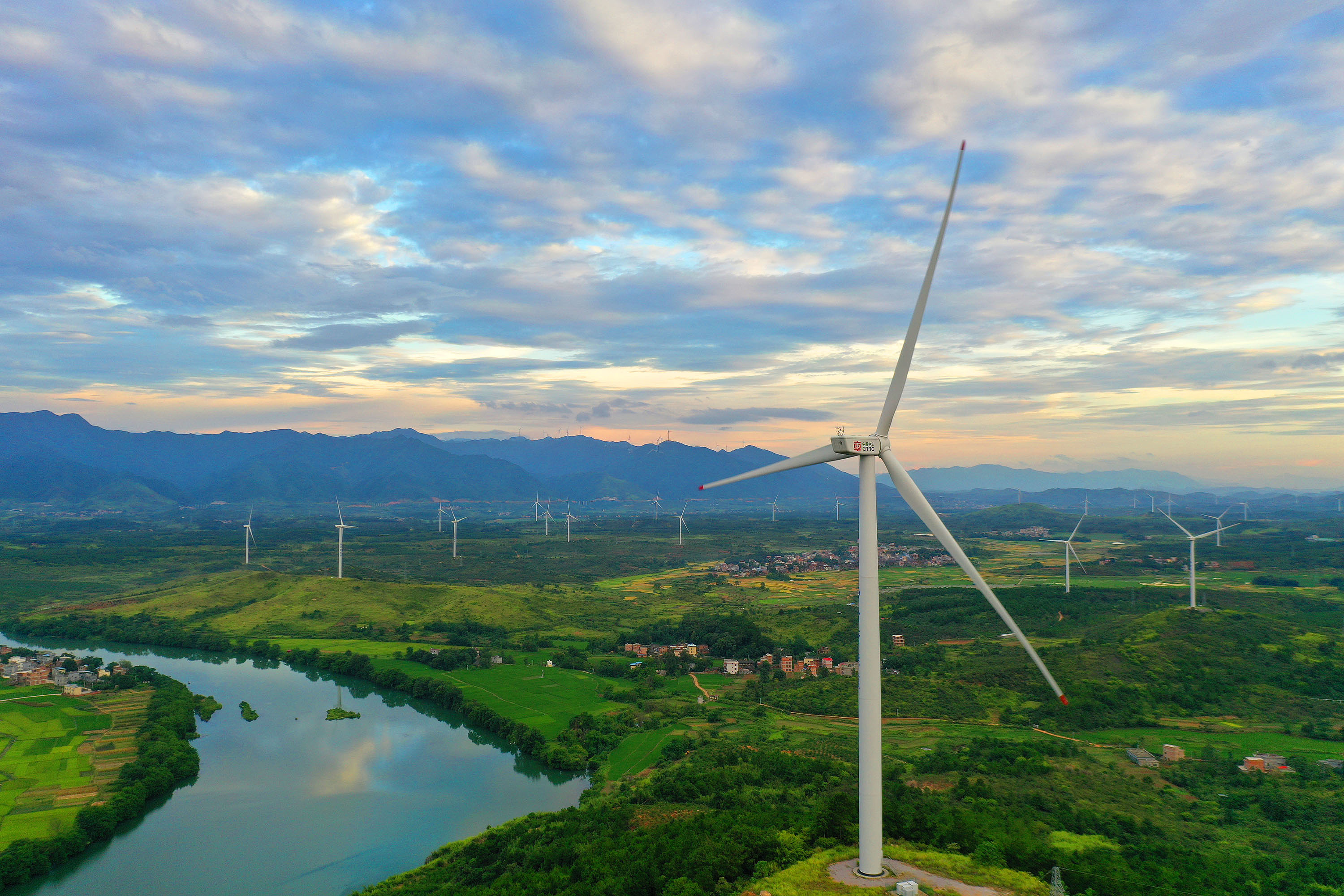 △ 湖南省永州市的風(fēng)力發(fā)電風(fēng)車(chē)與藍(lán)天、綠水、田野交相輝映,構(gòu)成一幅美麗的生態(tài)畫(huà)卷。