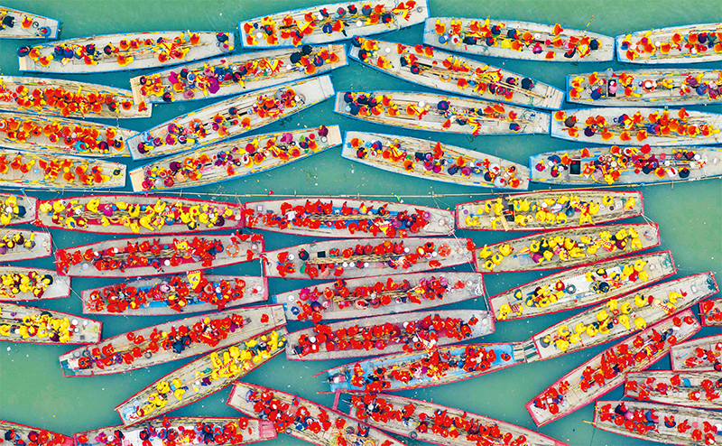 溱潼會船由南宋相沿至今,歷經(jīng)數(shù)百年傳承,被列入國家級非物質(zhì)文化遺產(chǎn)名錄。圖為2024年4月6日在江蘇省泰州市姜堰區(qū)溱湖國家濕地公園參加會船表演的船只。 新華社發(fā) 湯德宏/攝