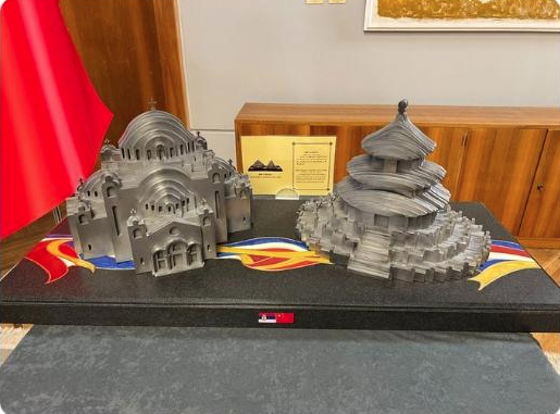 ??習近平主席送給武契奇兩件工藝品,分別是鋼材質(zhì)的天壇和圣薩瓦教堂造型。