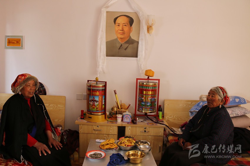 從餐廳出來(lái),記者走進(jìn)了一間15平方米左右的宿舍。兩位老人正坐在各自的木床上看電視,墻上掛著的液晶電視是連著機(jī)頂盒的。兩床之間,放著藏桌和床頭柜,藏桌上有瓜子、花生、酥油果子、牛肉等食品,亞瑪翁青老人熱情地說(shuō):“因?yàn)檎谶^藏歷新年,這些都是福利院為我們備的年貨,你也嘗嘗!”。房間里最引人注目的便是掛在床頭柜上方的系著哈達(dá)的毛主席畫像,兩位老人指著毛主席畫像動(dòng)情地說(shuō):“毛主席、共產(chǎn)黨是我們的恩人,看著他的畫像我們安心?!贝送猓块g里還有衣柜、配有馬桶的獨(dú)立廁所和盥洗臺(tái),毛巾、漱口盅、掃把、拖把都整齊地放在對(duì)應(yīng)位置。亞瑪翁青笑著說(shuō):“我們住的房間都趕得上縣城里的賓館了。”