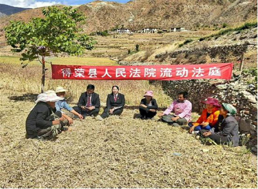 在曲雅貢鄉(xiāng)二號壩村進(jìn)行法律宣講時,村民澤某請求法院判決其和丈夫扎某離婚,“流動法庭”法官立即在田間地頭組織調(diào)解。調(diào)解過程中當(dāng)事人情緒抵觸、相互埋怨,尤其涉及到財產(chǎn)分割和子女撫養(yǎng)等問題時情緒波動大,場面一度僵持。法官憑借豐富的調(diào)解經(jīng)驗,先從講解相關(guān)法律規(guī)定入手,告知當(dāng)事人享有的權(quán)利義務(wù),而后對離婚財產(chǎn)分割、子女撫養(yǎng)問題從情理法多角度層層剖析,促使雙方達(dá)成和解協(xié)議,有效化解了矛盾?!傲鲃臃ㄍァ币孕僬{(diào)、以案說法,達(dá)到了審理一案、教育一片、穩(wěn)定一方的效果。