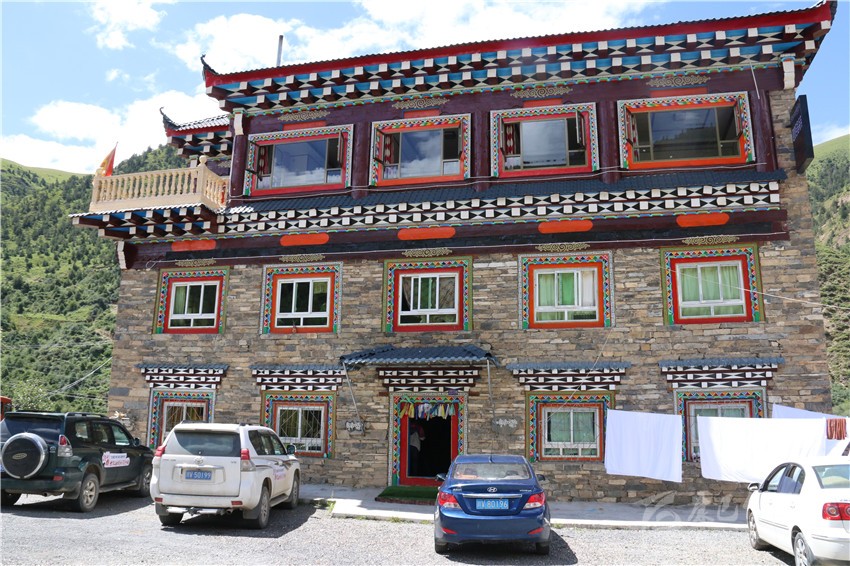 該酒店三樓一底,集餐飲、停車、住宿為一體,設單標間和套房共計22間38個床位,雇傭了3名當?shù)卮迕駧凸?,院?nèi)甚至配套了超市和茶樓;藏文化元素俯仰皆是,雕梁畫棟,規(guī)模配備,儼已成為全縣鄉(xiāng)鎮(zhèn)一道亮麗風景。不論淡旺季,每間房價188元至258元不等。夏季正值入住高峰期,8月以來,幾乎天天客滿。