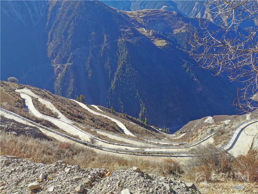 “然布村通村路路面寬4.5米、長(zhǎng)7227米,總投資1084萬元?!毙慢埧h交通局工程師唐世楊介紹說,“整條路有數(shù)十個(gè)急彎道,比山路十八彎還復(fù)雜險(xiǎn)峻,可以說是新龍縣最為‘陡、險(xiǎn)、 急’的山路?!?/p>