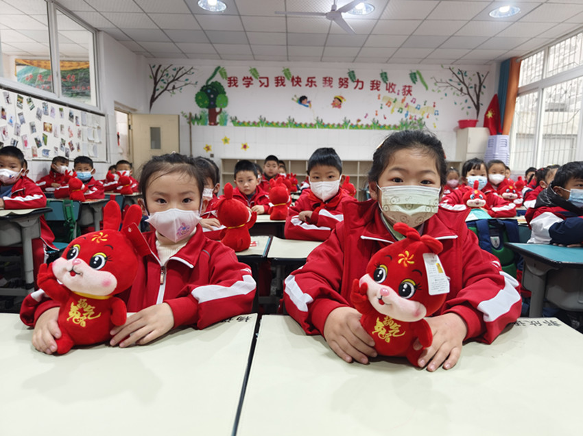 記者注意到,整個校園及各班教室都布置了精美的迎新文化墻,上面張貼懸掛著學生們在寒假生活中制作的主題創(chuàng)意海報。教室內,每張課桌上不僅插著寫滿祝福語的彩色氣球,還擺放著用紅絲帶打包好的新課本或一套精美文具或一只兔子玩偶,亦或是棒棒糖、旺仔牛奶等零食,均寓意新學期大吉大利、越來越棒、大展鴻“兔”、“兔”飛猛進。“這些別出心裁的小禮物,能給孩子們留下一個美好的記憶點,在給學生們帶來驚喜的同時,也送上一份最美、最真摯的新學期祝福!”教師黃宇虹說。