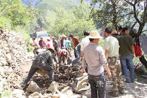 丹巴縣岳扎鄉(xiāng)納頂通村公路全長(zhǎng)里程13公里,惠及上、中、下納頂和斯交四村319戶1196人,因前期連續(xù)強(qiáng)降雨,納頂通村公路主干道垮塌嚴(yán)重,交通一度被阻斷,嚴(yán)重影響了村民的出行安全以及農(nóng)副產(chǎn)品外運(yùn)。為盡快搶通公路,多名干部群眾在水電企業(yè)裝載機(jī)的全程協(xié)助下,經(jīng)過近10個(gè)小時(shí)的連續(xù)奮戰(zhàn),終于完成了通村公路的清障工作。圖為村民們?cè)诠飞锨逭稀?(卿莉 攝影報(bào)道)