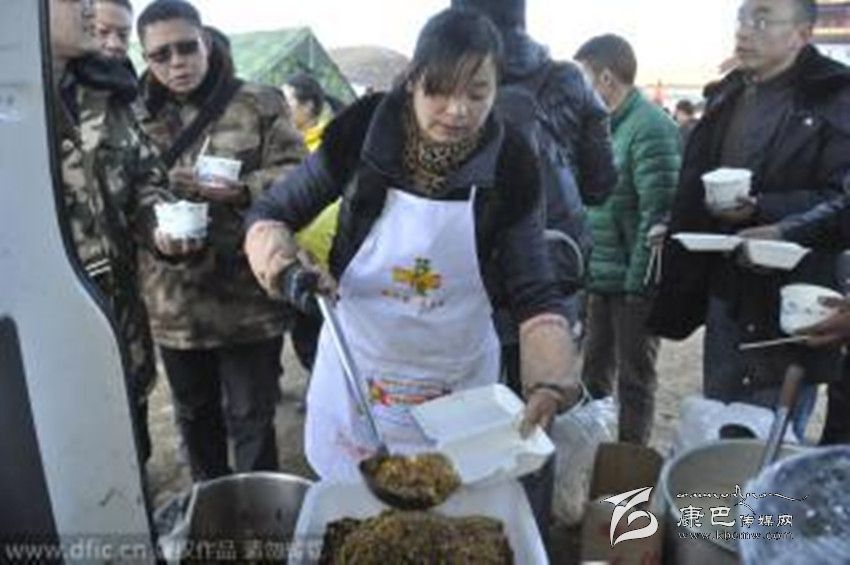 據(jù)了解,韓大哥是這家飯店的老板之一,他是仁壽縣人,幾年前和朋友來到新都橋開始經(jīng)營飯店??刀?.3級地震發(fā)生時,他人在成都。但看到災(zāi)情發(fā)生,韓大哥立即和飯店另外幾個合伙人決定到安置點免費送盒飯,“我在當(dāng)?shù)刈隽?、7年生意,現(xiàn)在出了事情,就應(yīng)該伸手支援嘛!”據(jù)韓大哥介紹,此次地震發(fā)生后,新都橋80%左右的飯店都已經(jīng)關(guān)門,他們的飯店因為還有一些接待工作,仍在正常營業(yè)。自11月23日晚上,他家的飯店就主動為塔公鎮(zhèn)的安置點免費派送盒飯,“包括中午和晚上兩頓,兩葷兩素一湯的配置。”因為太忙,  韓大哥來不及仔細(xì)統(tǒng)計,他大概知道每天送出的盒飯在1200盒到1500盒之間,每天送出盒飯的成本在4、5千左右。但在他看來,這些其實都算不上什么,“能為災(zāi)區(qū)出一份力,我們就很滿足了,我們打算一直送到抗震救災(zāi)工作結(jié)束,也就是直到災(zāi)民有條件自己做飯的時候。”“這邊天氣很冷,他們吃的一般是些面包、牛奶之類的干糧,我們就是想讓大家吃到熱飯、熱菜。”據(jù)韓大哥介紹,每天飯店都會派出3、4個人將盒飯運送到安置點,“只要有人需要我們都會分發(fā)盒飯,包括一些志愿者和武警官兵也吃我們的飯。