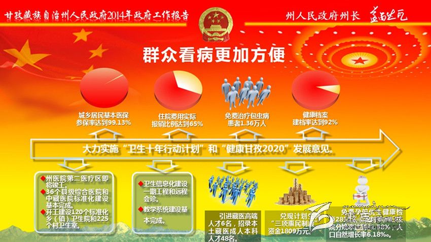 加大民生投入,全年民生支出139億元。全州城鎮(zhèn)新增就業(yè)7400人,城鄉(xiāng)低保實現(xiàn)應(yīng)保盡保;在全省民族地區(qū)率先實施醫(yī)療保險制度城鄉(xiāng)統(tǒng)籌,異地就醫(yī)即時結(jié)算全面啟動;在全省率先出臺大病醫(yī)療保險規(guī)定。教育事業(yè)加快發(fā)展。新建35所鄉(xiāng)中心幼兒園、22所片區(qū)寄宿制學(xué)校,州高級中學(xué)開工建設(shè)。全面落實教育助學(xué)惠民政策,兌現(xiàn)各類補(bǔ)助金4.58億元。城鄉(xiāng)居民基本醫(yī)保參保率達(dá)到99.13%,健康檔案建檔率達(dá)到92%;開工建設(shè)120個標(biāo)準(zhǔn)化鄉(xiāng)(鎮(zhèn))衛(wèi)生院和225個村衛(wèi)生室;衛(wèi)生信息化建設(shè)一期工程和遠(yuǎn)程會診、教學(xué)系統(tǒng)建設(shè)基本完成;兌現(xiàn)計劃生育“三項惠民制度”資金1809萬元。群眾文化生活日益豐富。建成縣“兩館”12個;開工建設(shè)州民族體育館、州農(nóng)牧民演藝培訓(xùn)中心和14個縣級全民健身中心,建成農(nóng)民體育健身工程739個;開展 “送文化下鄉(xiāng)”近千場;康巴文化研究院“四大工程”全面啟動。深入實施“百千萬康巴英才工程”,人才科技工作扎實有效。扶貧移民工作成效明顯。完成1360個貧困村、19.91萬扶貧對象立卡建檔工作;實施整村推進(jìn)63個、連片開發(fā)項目4個、彝家新寨(村)17個、索改橋23座,易地扶貧搬遷9850人,2.65萬群眾生產(chǎn)生活條件得到改善。