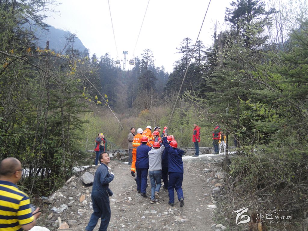應急演練活動是模擬索道發(fā)生脫索故障,開展人工救護應急訓練。在演練活動中,海螺溝客運索道出現(xiàn)故障不能運轉,在1C支架和2#支架之間,兩個車廂共有三名游客滯留空中。海螺溝旅游索道公司立即啟動應急預案,救護總指揮下達救援指令。后勤組成員對著車廂喊話,穩(wěn)定游客情緒。救護小組全體人員,安全、有序、迅速到達各自崗位,地面工作人員與空中救援人員相互配合,同時密切注意被困乘客的安全情況,正確操作各項程序,僅用半個小時就將被困乘客送到地面,安全完成營救。地面輔助救護人員立即對被營救人員進行現(xiàn)場檢查和救治,保障了被營救人員的生命安全,應急演練活動圓滿完成。