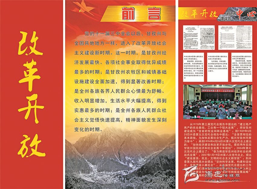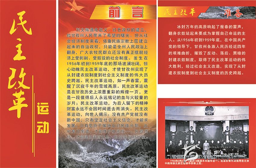 《甘孜州檔案館愛國主義教育基地》的整個(gè)展覽分為四大板塊。第一部分命名為“自治政權(quán)的建立”,向參觀者介紹了甘孜藏族自治州誕生的歷史過程;第二部分是“民主改革運(yùn)動”,把人們帶回了那段不能忘記的烽火歲月;第三部分是“社會主義建設(shè)”,深情地回顧了在建設(shè)社會主義事業(yè)中我州所取得的不平凡的成就;第四部分是“改革開放”,讓人們重溫了在改革開放的大潮中所經(jīng)歷的那些充滿激情的經(jīng)歷。