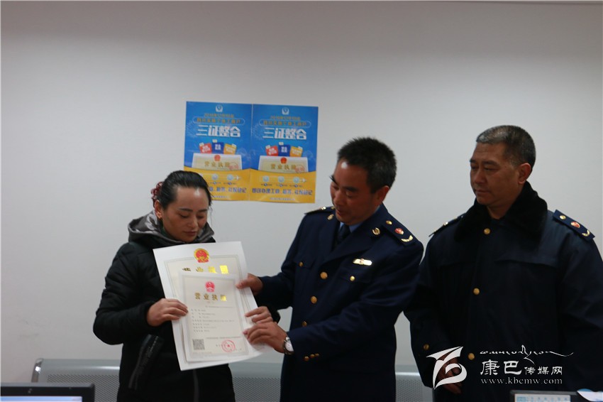 本網(wǎng)訊(迎春 文/圖)12月1日上午,我州首張個(gè)體工商戶(hù)“三證整合”營(yíng)業(yè)執(zhí)照在康定市食藥工商局工商所辦證窗口,由州工商局副局長(zhǎng)席小康和康定市食藥工質(zhì)局局長(zhǎng)楊永勝一同,把新版?zhèn)€體工商戶(hù)“三證整合”營(yíng)業(yè)執(zhí)照發(fā)放到個(gè)體工商戶(hù)張春碧手中。首發(fā)個(gè)體工商戶(hù)“三證整合”營(yíng)業(yè)執(zhí)照拉開(kāi)了我州個(gè)體工商戶(hù)“三證整合”登記的帷幕。今后,公民只需填寫(xiě)“一張表”,向“一個(gè)窗口”提交“一套材料”即可辦理個(gè)體工商戶(hù)、稅務(wù)登記及社會(huì)保險(xiǎn)登記。截止12月1日12點(diǎn),我州共計(jì)發(fā)放個(gè)體工商戶(hù)“三證合整”新版營(yíng)業(yè)執(zhí)照15份。