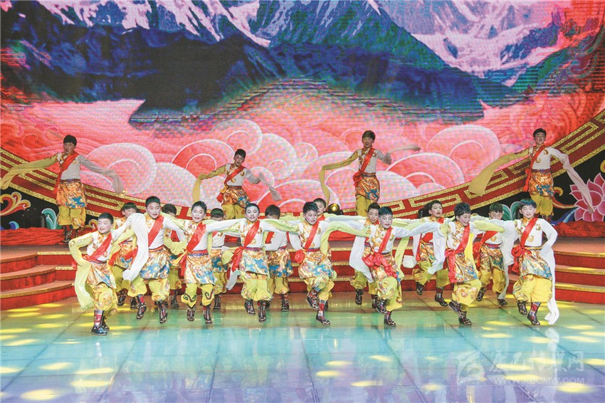 在團拜會節(jié)目演出環(huán)節(jié),隨著主持人一句“柳綠枝頭待燕歸,金雞賀歲開門紅”脫口而出,20余名活潑、歡快的少年涌上舞臺,就著音樂的節(jié)拍,揮手踏足、左挪右轉,翩翩起舞;少年們舞動的長袖映著縷縷斑斕的光束,依如雄鷹在拍打著飛翔的翅膀。這便是此次演出的開場節(jié)目《雛鷹飛翔》,一場絢麗多彩的“甘孜春晚”由此火熱開演。隨后,一群體態(tài)輕盈、妝如仙鶴的女子用靈動的舞姿為甘孜祈福,點明了此次團拜會的一大主旨——祝福甘孜。