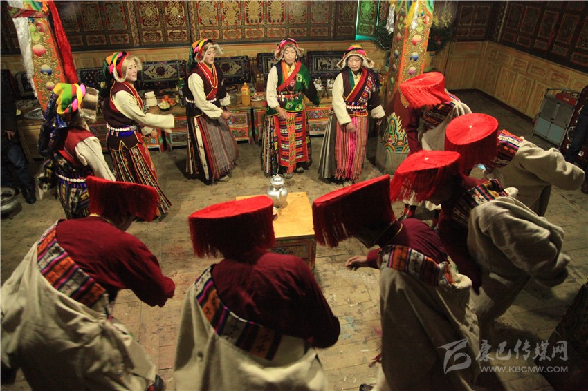 一家人穿上節(jié)日盛裝,按輩序就座。主婦手捧吉祥斗恭恭敬敬地走到長輩跟前說“扎西德勒”,對方抓幾粒麥子邊向上撒邊祝福說:“扎西德勒!美滿幸福,祝主婦身體健康,預(yù)祝明年大家仍如此團(tuán)聚歡慶?!痹僮ヒ稽c(diǎn)切瑪送進(jìn)嘴里。家庭儀式后,家中兩人一個拿青稞酒、銀酒碗,一個手捧切瑪,到左鄰右舍、親朋好友家拜年,敬獻(xiàn)切瑪、青稞酒,互相祝福。