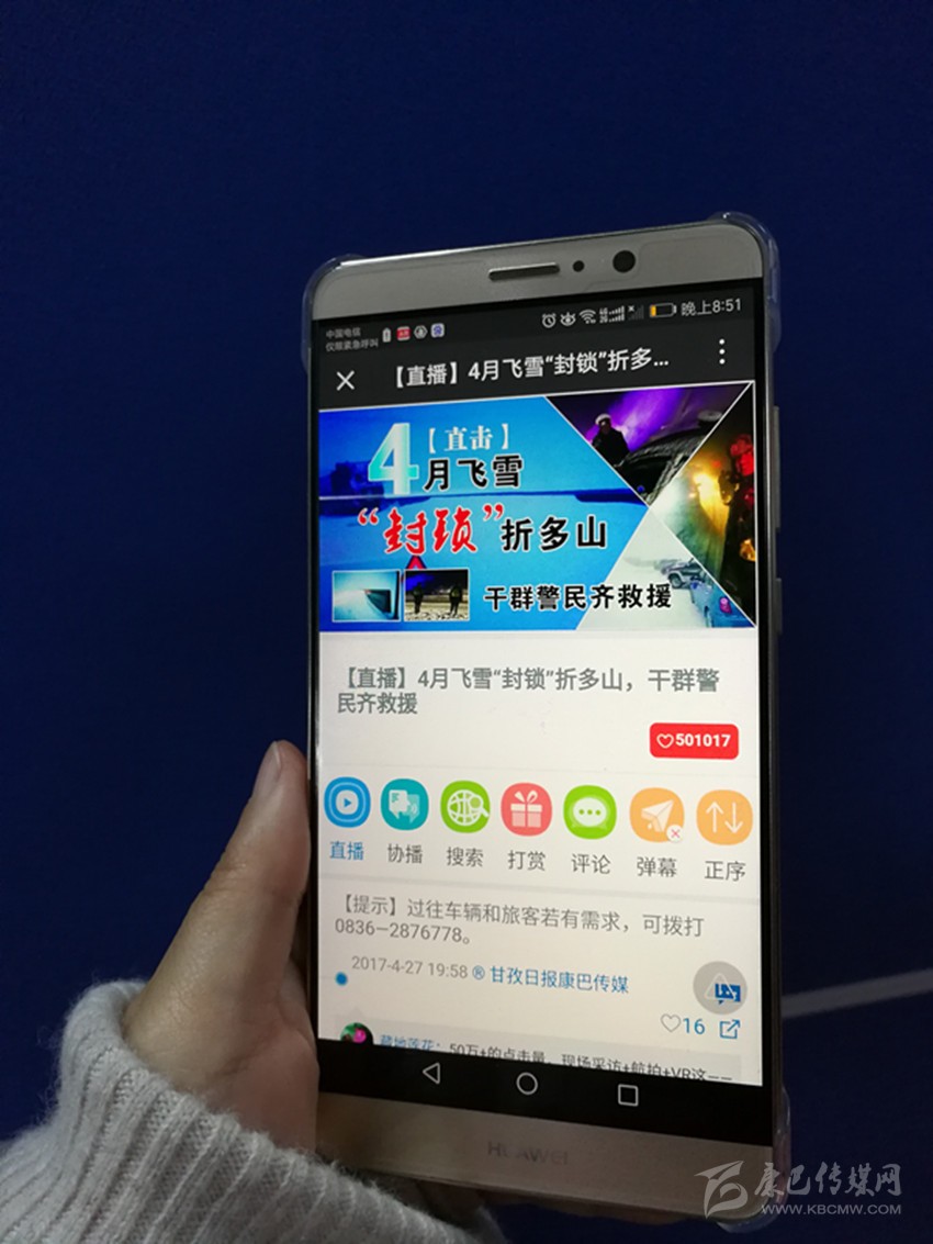 一路上,記者通過甘孜日?qǐng)?bào)微信平臺(tái),將救援情況和群眾的實(shí)況,第一時(shí)間進(jìn)行了直播。隨著一條條現(xiàn)場(chǎng)圖片、文字和視頻的及時(shí)發(fā)布,人們第一時(shí)間得知了折多山受困車輛和群眾得到救助的實(shí)際情況,人們紛紛在直播平臺(tái)留言,為交通、路政和當(dāng)?shù)攸h委、政府的救援行動(dòng)點(diǎn)贊。在對(duì)折多山強(qiáng)降雪和受堵現(xiàn)場(chǎng)進(jìn)行直播報(bào)道的同時(shí),甘孜日?qǐng)?bào)社還利用直播平臺(tái),回顧了折多山道路交通難的歷史,并再次發(fā)布雅康高速修建、折多山隧道立項(xiàng)等重大交通建設(shè)工程的進(jìn)展情況,又對(duì)此次折多山風(fēng)雪阻斷道路交通,導(dǎo)致車輛和人群滯留的特殊原因進(jìn)行了報(bào)道和澄清,并報(bào)道了風(fēng)雪中仍有不少徒步游客繼續(xù)甘孜之旅的情況,第一時(shí)間讓更多的人了解到,飛雪并未對(duì)道路造成致命影響,甘孜州的道路交通狀況和應(yīng)急處置能力已經(jīng)得到了極大的提升,完全有能力保障人們出行以及生命、財(cái)產(chǎn)安全。
