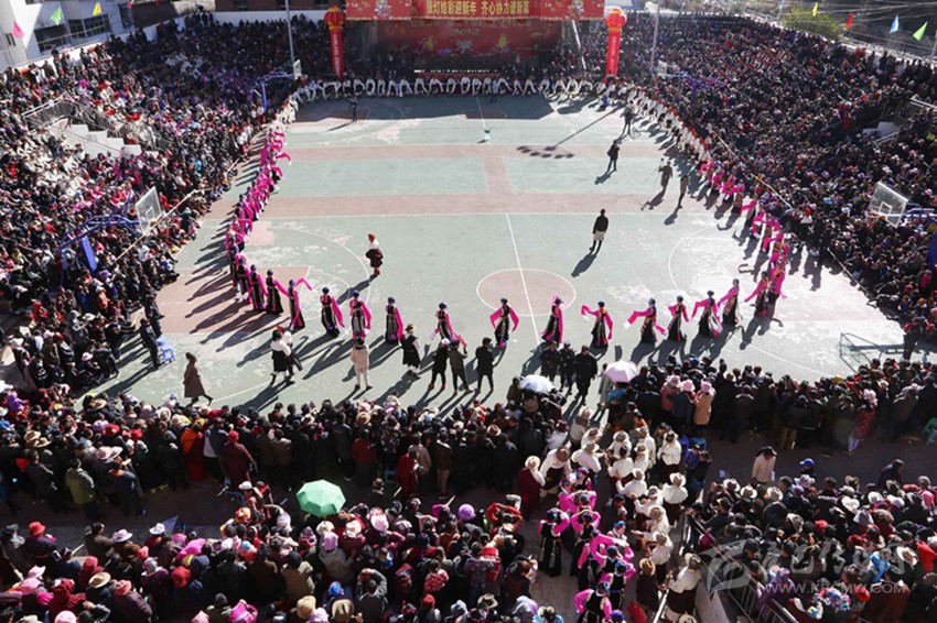 當(dāng)日晚,該縣舉辦新春篝火鍋莊晚會(huì),縣內(nèi)的快樂阿媽、夕陽(yáng)紅等7支藝術(shù)團(tuán)到場(chǎng)表演,她們身著瘋裝、穿戴華麗,用鍋莊舞共慶佳節(jié)。歡快的旋律、優(yōu)美的舞蹈,吸引了大批市民參與其中,整場(chǎng)晚會(huì)氣氛熱烈、其樂融融。