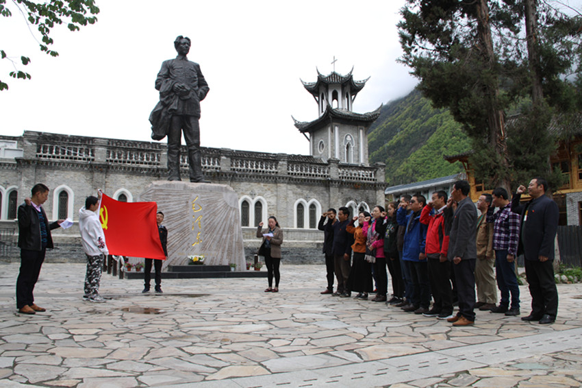 本網(wǎng)訊 (本網(wǎng)記者 秦松 攝影報道)日前,甘孜日報社全體黨員與群眾工作全覆蓋結(jié)對共建共創(chuàng)的海螺溝燕子溝鎮(zhèn)的躍進(jìn)坪村支部、南門關(guān)村支部、麻柳林村支部、喇嘛溝村支部的黨員,懷著崇敬的心情來到磨西長征紀(jì)念館毛主席塑像前,舉行緬懷革命先烈、重溫入黨誓詞活動?;顒又校h員們還與共建共創(chuàng)支部黨員進(jìn)行了座談。圖為宣誓活動現(xiàn)場。
