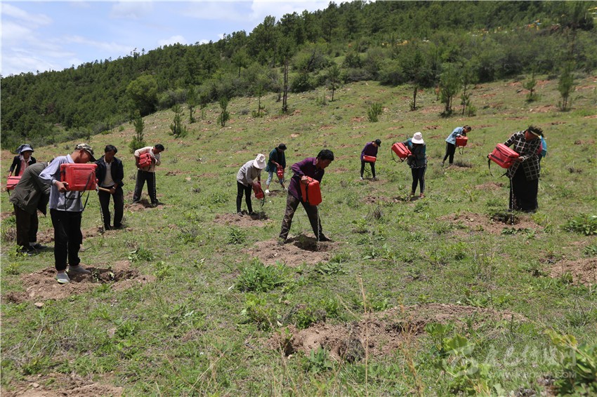鄉(xiāng)城縣熱麥村群眾在為栽植的毛桃樹(shù)澆水。