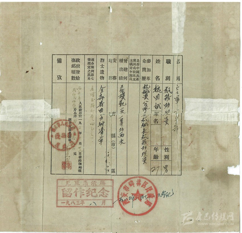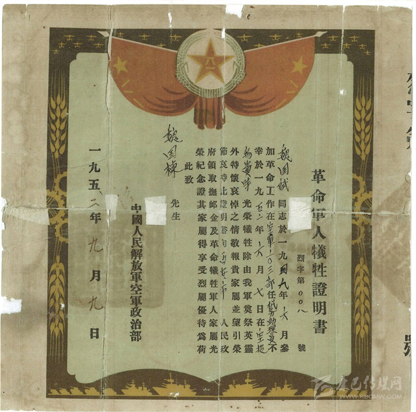 魏國賓革命犧牲軍人家屬光榮紀念證。