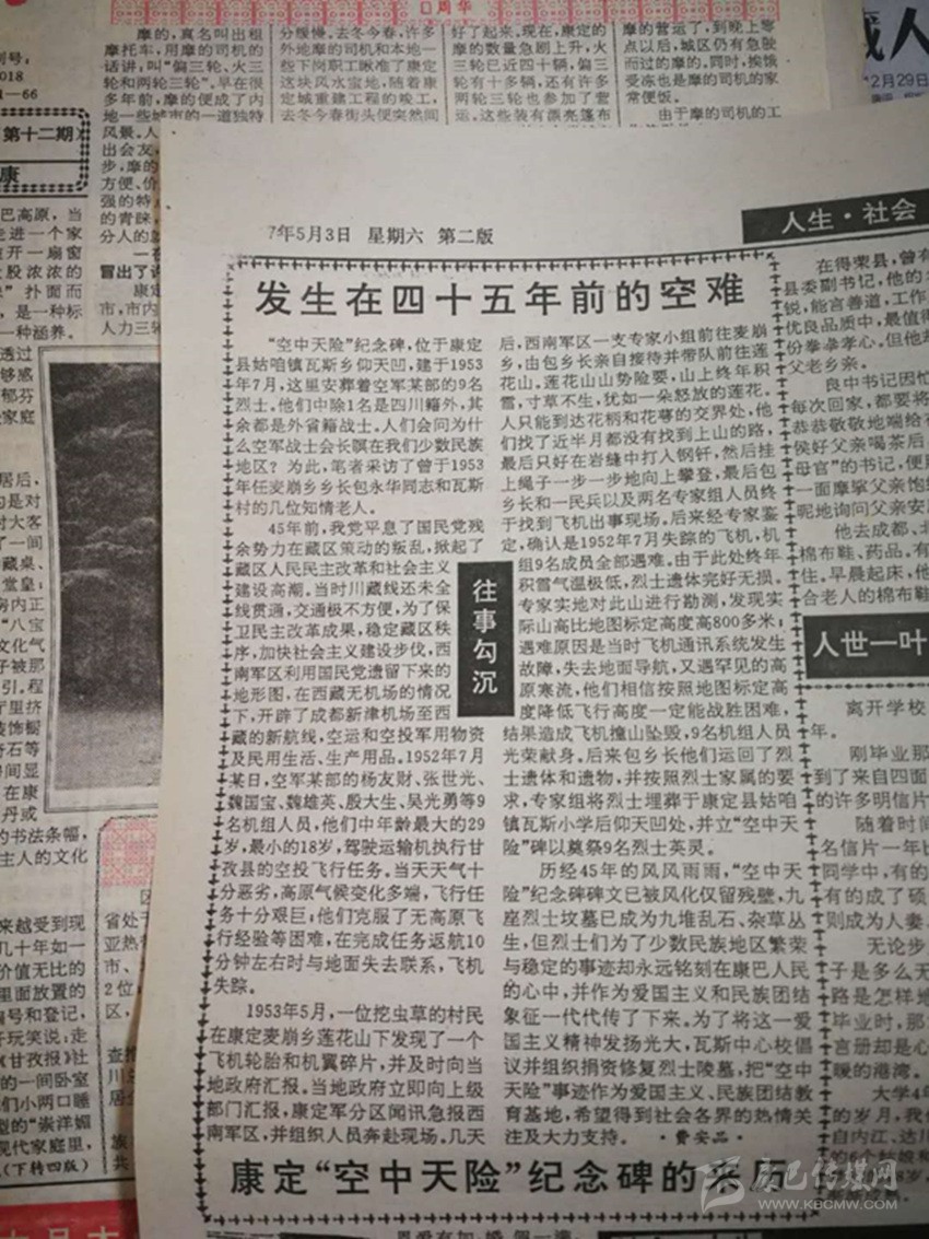 《甘孜日報》1997年5月3日第二版刊登了《發(fā)生在四十五年前的空難——康定“空中天險”紀念碑的來歷》一文,詳細記錄了1952年空軍某部9名人員駕駛運輸機執(zhí)行空投飛行任務,不幸在康定地區(qū)撞山墜毀,英勇犧牲的故事。這9名烈士后被當?shù)厝罕姲苍?,建立“空軍墓”和“空中天險”紀念碑。 作為烈士犧牲地的甘孜多年來一直在尋找這9名烈士家屬,以圖告慰英靈。但由于線索有限,一直未有結果。