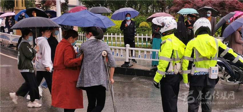 這邊剛幫助考生尋回遺失的準(zhǔn)考證,那邊一名杵著拐杖的考生引起了執(zhí)勤交警的注意,這時(shí)這名考生在家長(zhǎng)的攙扶下正準(zhǔn)備過(guò)馬路,交警見(jiàn)狀,立即上前為其疏導(dǎo)交通,開(kāi)辟出綠色通道。記者了解到,這名考生叫段尚玲,兩周前意外摔傷了腿,這給她的應(yīng)試之路帶來(lái)了不少麻煩,幸好在交警的幫助下,她安全順利地進(jìn)入了考場(chǎng)。