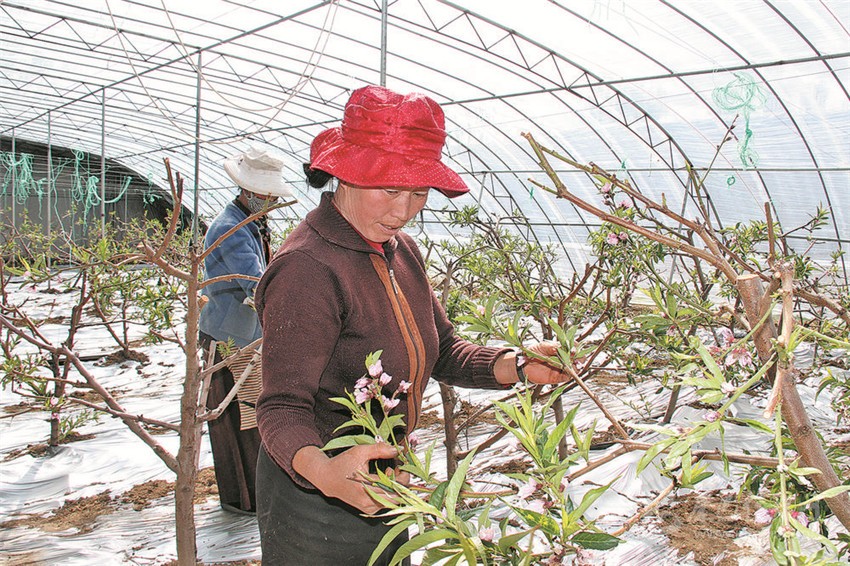 圖為當?shù)貏?wù)工農(nóng)牧民正在給高原大棚桃樹疏枝。