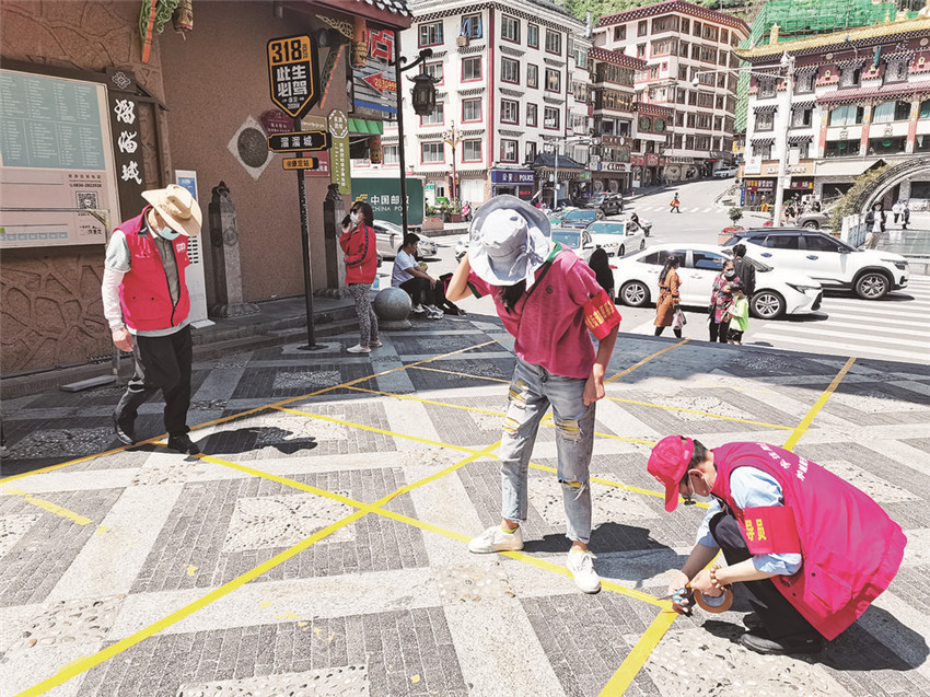 康定市志愿者正在粘貼核酸檢測排隊(duì)間隔線。