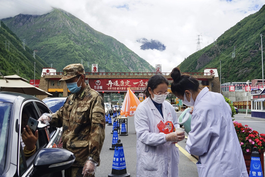 地震又遇疫情。大量救援隊進入災(zāi)區(qū),加大了當?shù)匾咔榉揽氐膲毫?。為減輕當?shù)胤酪邏毫Γ?月6日,州藏醫(yī)院再次抽派8名醫(yī)務(wù)人員組成兩支核酸采樣隊,奔赴瀘定縣得妥鎮(zhèn)火線支援疫情防控工作。核酸采樣隊到達目的地后,在應(yīng)急指揮部的安排下,迅速投入到了緊張有序的采樣工作中。截止撤離時,共為當?shù)亻_展了1萬余人次的核酸采樣。