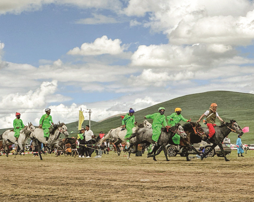 賽馬是藏族群眾娛樂(lè)生活的主要內(nèi)容,是極具特色的民俗活動(dòng),是藏族群眾對(duì)力量、勇敢、智慧的向往和崇拜,也是一項(xiàng)充滿(mǎn)激情的傳統(tǒng)民族體育運(yùn)動(dòng)。近年來(lái),色達(dá)縣利用“金馬節(jié)”這一傳統(tǒng)民族節(jié)日,開(kāi)展了長(zhǎng)跑、短跑和走馬等賽馬比賽,在遼闊的扎青塘草原中央,騎手們與賽馬緊密配合,英姿颯爽,風(fēng)采盡顯,卓越的表現(xiàn)引得場(chǎng)外加油聲、喝彩聲此起彼伏,群馬奔騰的景象震撼人心,讓前來(lái)觀賽的群眾大飽眼福,嘆為觀止。