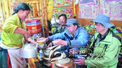位于宗塔草原“大盆地”東邊山坡的降巴牧場(chǎng)在隊(duì)員們的心里也留下了深刻的印記。15日早上5點(diǎn)半隊(duì)員們就出發(fā)上了降巴牧場(chǎng)。朝霞映紅了天邊,紅云罩著青草牛糞味飄香的草坡。比采風(fēng)隊(duì)員們起得更早的牧人已擠完了牛奶,一個(gè)僅10 歲的女孩正在草坡上拾牛糞;牛毛帳篷里,勤勞的牧婦已打開了牛奶分離器開始分離酥油了……一問(wèn),方知牧民們今晨4點(diǎn)就起床勞作,干完早上的活兒,他們要趕到三公里遠(yuǎn)的“盆地”耍壩子,看賽馬。這個(gè)牧場(chǎng)靜謐潔凈得令人稱奇,青青的草坡上絕少有垃圾存留,沒見到一只兇惡的牧犬;按季節(jié)劃分的草場(chǎng)由整潔的網(wǎng)圍欄圈開,分隔有致;牧人舉家出門,連帳篷門也不掩,據(jù)說(shuō)這里沒有偷盜發(fā)生,家人和諧;古老、平和的氣氛中,晨風(fēng)輕拂,野花青草搖曳,輕柔的晨霧中偶而傳來(lái)兩聲牛哞,讓人頓感心靜如水。對(duì)于長(zhǎng)期居住城市的人來(lái)說(shuō),這里無(wú)疑是“幽雅天堂”了。