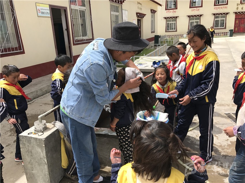 爾金老師給學生洗頭。