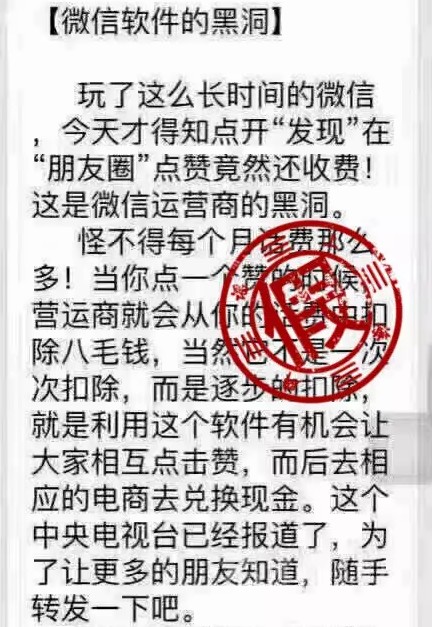 近日,微信群中流傳一條消息稱:“玩了這么長時間的微信,今天才得知點贊竟然還收費。當你點一個贊的時候,運營商就會從你的話費中扣除八毛錢……中央電視臺已經(jīng)報道了。”