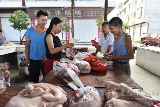 8月15日,南部縣長(zhǎng)坪鎮(zhèn)農(nóng)貿(mào)市場(chǎng),正在買肉的周強(qiáng)善。攝影 張可凡