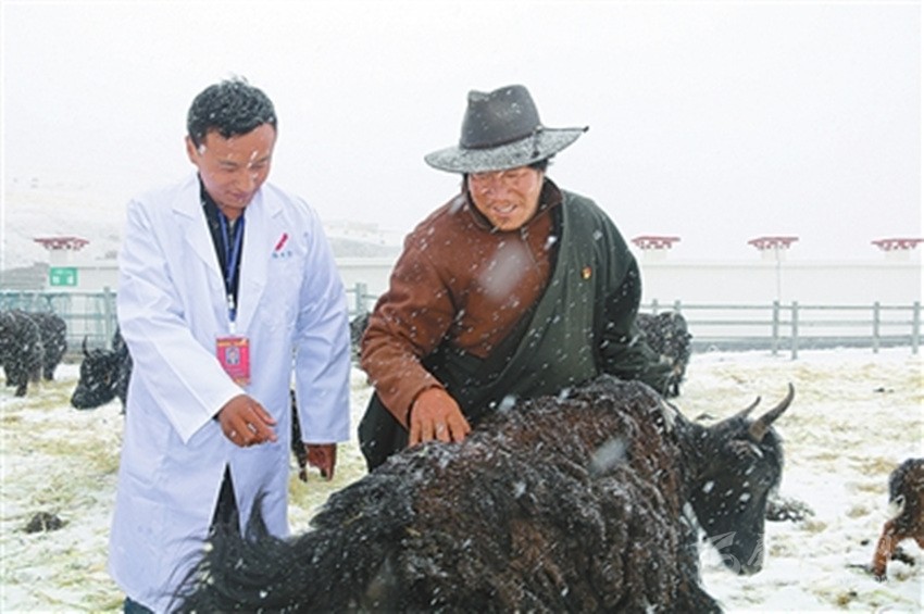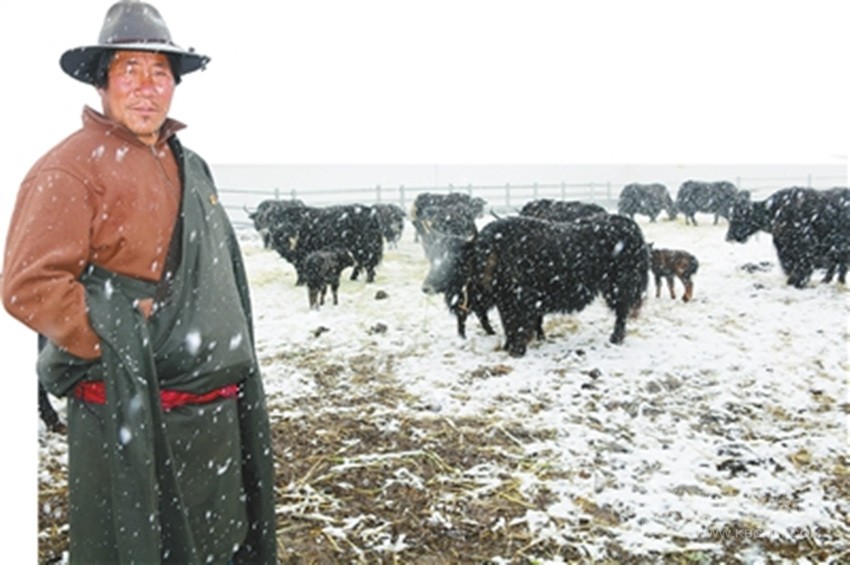 5月8日,甘孜縣達通瑪片區(qū)大雪飛揚。在茶扎鄉(xiāng)銀多村集體牧場,放養(yǎng)人員格絨正在給上百頭牦牛喂草料,他喜滋滋地說,通過牧民儲備和農(nóng)牧農(nóng)村局提供草料的方式,牦??梢园踩^冬。銀多村現(xiàn)代化集體牧場合作社成立一年多的時間,共出欄牦牛16頭,總收益67380元,除去20%預(yù)留金,村民有了一定的收入,而作為放牧人員,他管理了52頭牦牛,一年有1.2萬元的收入。