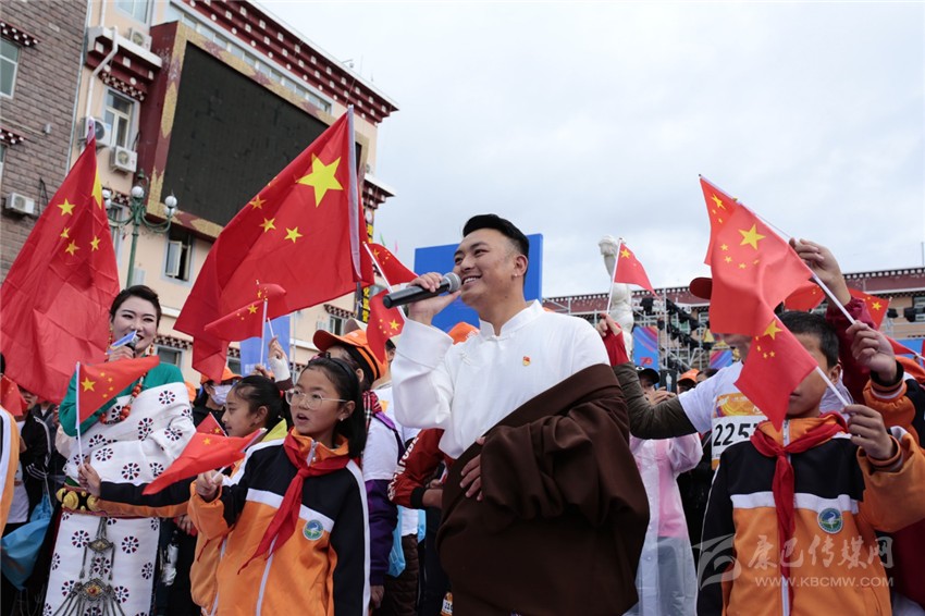 在開幕式上,藏族男女飽含真情領(lǐng)唱《歌唱祖國》,緊接著,托舉五星紅旗的儀仗隊(duì)緩緩進(jìn)場。當(dāng)雄壯的《義勇軍進(jìn)行曲》響起,跑者、老師、學(xué)生、干部、農(nóng)牧民群眾等向冉冉升起的國旗行注目禮,心里升騰起無比的自豪。