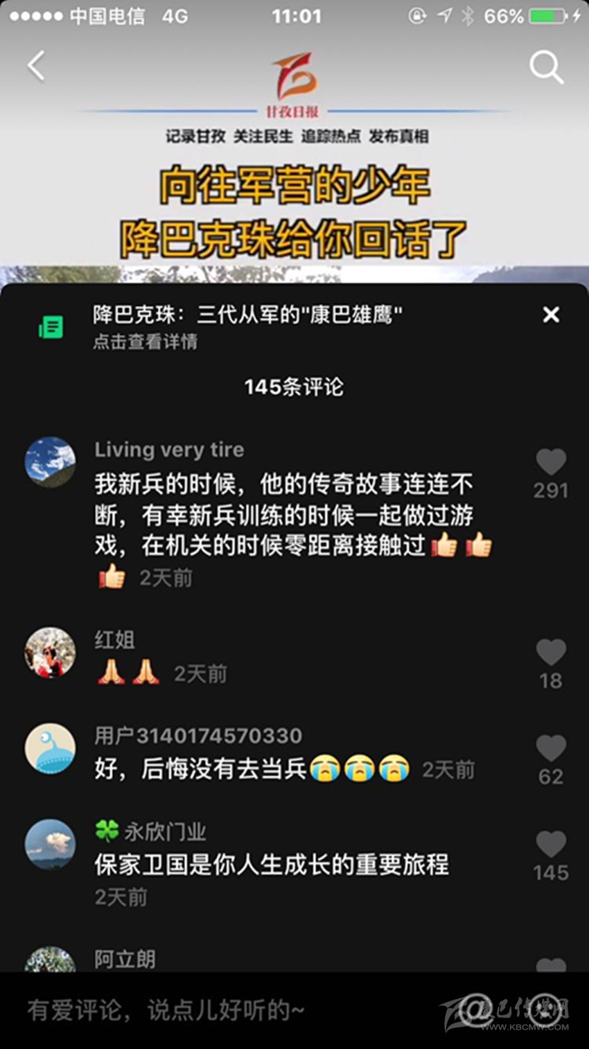 三段視頻,六百多條留言,近兩千萬次播放,一個藏族少年的軍旅夢在網(wǎng)絡上熱烈綻放,而農(nóng)牧區(qū)許多青年的軍旅夢也就此被點燃,忠勇大愛的“血脈”在康巴高原傳承! (本網(wǎng)記者 肖宵 整理)