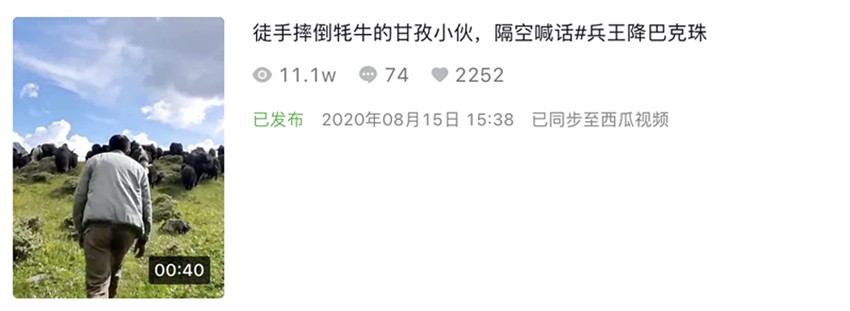 8月3日,這段僅有10秒長的視頻,在抖音短視頻平臺《甘孜日報》康巴傳媒抖音號發(fā)布后,短短一天內(nèi)獲得了800多萬次播放量,200多名網(wǎng)友留言評論,18萬次點贊更是“宣告”其正式成為“網(wǎng)絡爆款”。