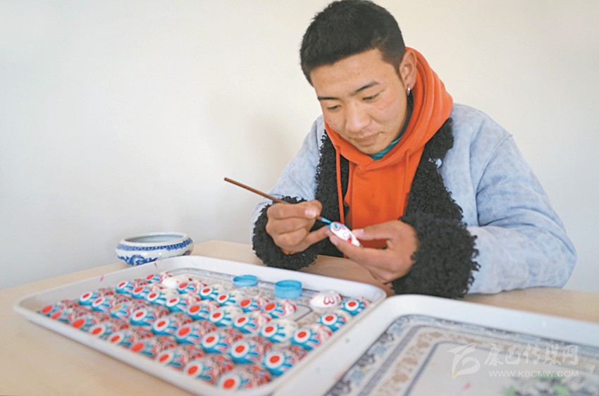 本著自主自愿的原則,教學班結(jié)束后,65名藏族青年主動加入扶貧彩繪實訓班,成為項目的第一批學員。“實訓期間不需要交任何費用,還包吃住。我對畫京劇臉譜很有興趣,我們第一個月學習繪畫基本功,第二個月開始,根據(jù)成品質(zhì)量,就可以計件得酬勞,學習期間我每月能掙500多元。”邛批說。