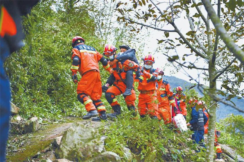 救援隊員協(xié)助紫雅場村最后一批村民下山,他們隨后將通過水路轉(zhuǎn)移至設在得妥鎮(zhèn)場鎮(zhèn)的受災群眾安置點。 四川日報全媒體記者 楊樹 攝