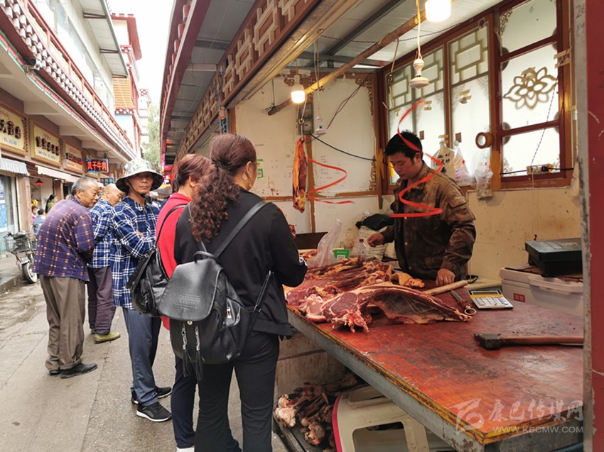 今年高考比去年提前了一個月,進州的游客比去年來得更早,數(shù)量也更多。商販扎西阿達告訴記者,從五一節(jié)到現(xiàn)在,自己的牦牛肉都賣得不錯,每天都要殺一頭牦牛,生意好的話,下午三點鐘就可以賣光。