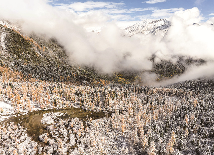 雪山、藍天白云和黨嶺村的彩林構成一幅優(yōu)美的畫卷。新華社 發(fā)