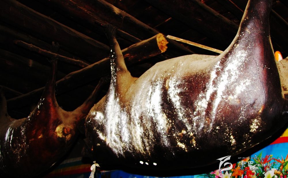 臭豬肉用扎壩語準確翻譯應譯“陳豬肉”或“舊豬肉”。由于其惡味乍聞重于“臭豆腐”,濃于廣東的“酶香咸魚”,所以稱“臭豬肉”。但扎壩人卻視之為上品,極其愛吃,并作為居家待客的最高珍品,家家戶戶都要熏制存放,且越存放得久越被視為珍貴,因此,在扎壩地區(qū),家中懸掛多少“臭豬肉 ”和懸掛的年限多少也自然成為當地衡量貧富的象征。