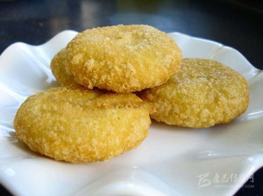 3.包餡成型:用皮坯包上餡心,收好口,再用手把餅坯做成邊沿較厚、中間稍薄的氈帽狀即成餅坯。4.炸制:把菜油燒成七成熟,將餅坯從鍋邊滑入鍋內(nèi)炸至色澤金黃,皮酥即成。產(chǎn)品特點 皮酥脆,內(nèi)軟糯,香甜爽口。
