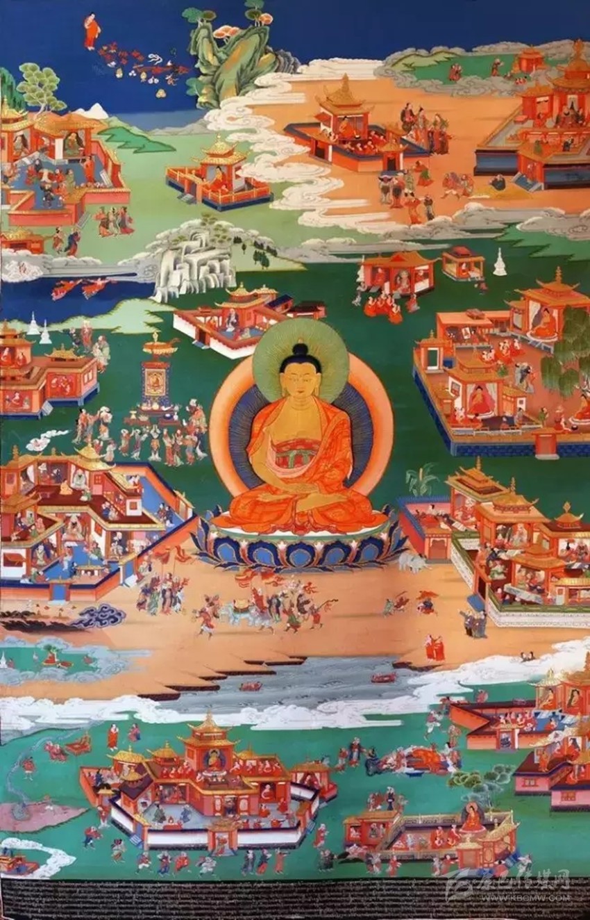 這套《如意寶藤》唐卡畫是在十七世紀(jì),東谷寺第六世活佛降巴更登嘉措命畫師郎卡杰繪制而成。傳說(shuō)在十七世紀(jì),在今爐霍縣境內(nèi)的一個(gè)地方,有戶農(nóng)民家生了一名聰明伶俐的小男孩,因其家境貧困從小就當(dāng)童工,為別人放牧維持生活,其乳名為孜珠(牧童)。孜珠非常喜歡繪畫,平常利用放牧的空閑學(xué)畫,沒(méi)有紙張筆墨,晴天里他把地當(dāng)紙,用小棍做筆, 陰天用石板作紙,小石子作筆每天堅(jiān)持學(xué)習(xí)繪畫。他在極其艱苦的環(huán)境中,勤學(xué)好問(wèn),刻苦鉆研繪畫知識(shí)及其基本技巧。他刻苦學(xué)畫的恒心和誠(chéng)意,感動(dòng)了神仙畫師毗首羯摩。在一個(gè)良辰吉日神仙畫師來(lái)到人間收孜珠為徒,把自己的所有知識(shí)傳授于他。